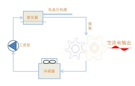 基于有機(jī)郎肯循環(huán)(Organic Rankine Cycle簡稱ORC)原理,利用低品位熱源產(chǎn)生動力:通過低沸點(diǎn)有機(jī)工質(zhì)獲取其他介質(zhì)的熱能,轉(zhuǎn)化為壓力能,通過膨脹機(jī)將壓力能轉(zhuǎn)化為機(jī)械能,最終通過發(fā)電機(jī)將機(jī)械能轉(zhuǎn)化為電能。